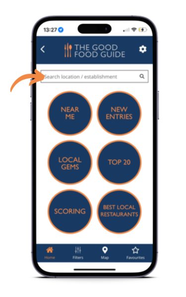 1. Click 'The Guide' on the homepage and then the filter icon in the top right hand corner. Click into the search bar and enter in a location or establishment you would like to explore.
