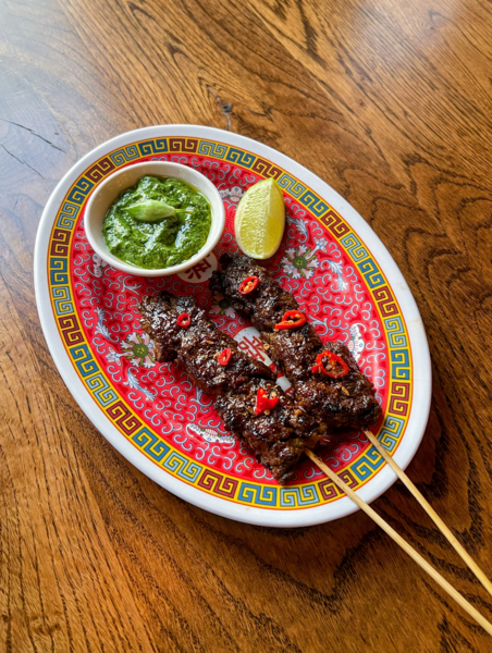This version features deeply flavoured bavette steak marinated in an earthy, aromatic spice paste, served with a sprightly sauce. The marinade is largely based on the Indonesian version but we’ve added a Malaysian influence of turmeric and lemongrass. Instant coffee is not a usual ingredient in satay, but I love the bitter complexity it brings to the marinade.