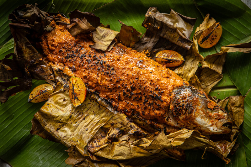Wrap the fish in the banana leaves or baking paper and foil and cook on a baking sheet for 40 minutes or until the flesh comes away from the bone at the thickest part when tested with a skewer.
