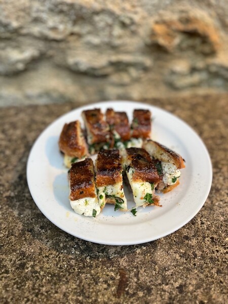 I have put together a Somerset-y version of it below, including a bread recipe that is genuinely very simple and perfect for the sandwich but of course a good baguette will very much do the trick if time is a pressure. A focaccia-type dough roughly shaped and baked hot and dark. Filled with fried sausage, mozzarella and finely chopped wild garlic. A cold beer is emphatically the serving suggestion.