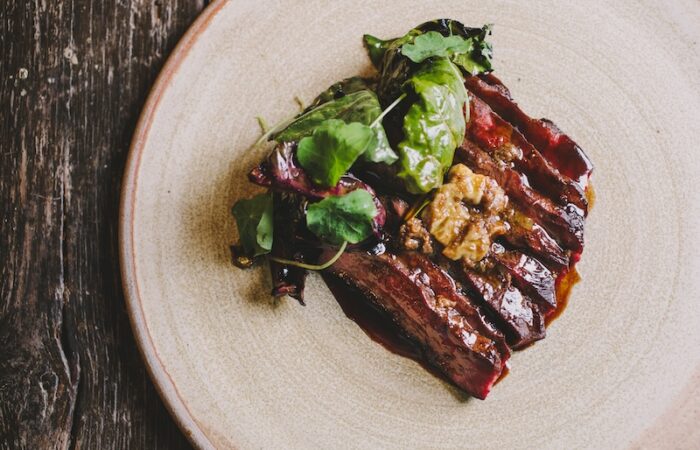 Ex-dairy beef comes in tartare form on a complex snack of rosti potatoes with tomato emulsion made using tomato ‘waste’, lacto-fermented gem lettuce from last year’s harvest and radish. A busy few bites, flavour-wise, and actually the sweet beef shone more brightly as a simple flatiron with black garlic and onion miso butter and chard.