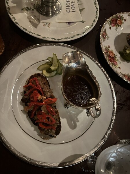 Mirrors are scrawled with red painted slogans like ‘in my porterhouse era’, which inspired our main course of a kilogram porterhouse steak. It arrived beautifully cooked and rested and called for sides of beef dripping chips, barbecued baby gem with anchovy dressing, and broccoli and walnut salad. All sides are competitively priced at under £5 and from the line-up of the classic steak sauces, the chop sauce stole the show on our visit.