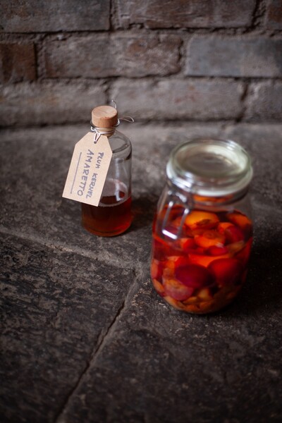 'Every autumn during plum season, when our chefs are busy preserving the actual flesh of the fruit, we always have a jar with some form of neutral spirit (vodka or new make) around and throughout autumn, we keep throwing leftover plum kernels in. Plum trees, just like cherry, apricot or peach, are from the same family as almonds - Rosaceae. Their kernels contain multiple compounds, mainly benzaldehyde, which smells like bitter almond. Over time, when we leave them in spirit for a couple of months, this aroma will become very pronounced. When we feel like the flavour is strong enough, we simply strain the liquid off the kernels and add sugar and water to taste.