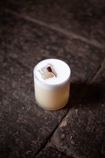 In the restaurants we like to garnish our amaretto sour with a preserved cherry blossom, but it is also delicious with a glace cherry.