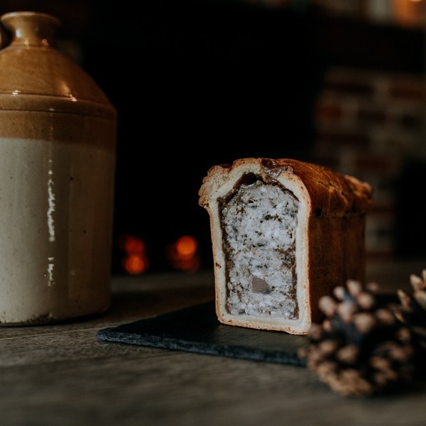 ‘It's a labour of love,’ says Tim Wilson, who sources whole Tamworth Pigs from a local smallholding. ‘The hot water crust pastry is made using flare fat from the underside of the ribs, it is then lined with very thin strips of guanciale made from the cheek. The filling uses the pig's liver, heart and tongue along with some shoulder meat, sweated onions, herbs, spices, brandy, cream and eggs. We garnish the pâté with strips of tenderloin from the pig, sometimes smoked duck from nearby Longland Farm, pistachios and the occasional booze-soaked prune. Finally, after cooking we fill the croûte with hot jellied stock made with the bones from the pig, flavoured with apple cider vinegar made from the apples here on the farm.’