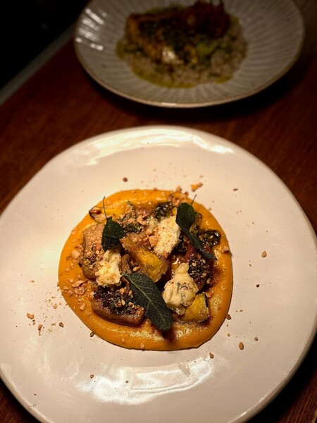 Potatoes are folded into flour to form the base of this glorious gnocchi dish at the Pack Horse. An autumnal combination showcasing the best of the county's produce with hazelnut, roasted squash, sage and parsley. Finished with flecks of Beauvale - an English blue cheese made in the Peak District and known for its mellow blue funk.