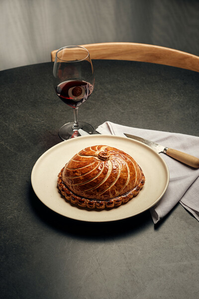 Place the larger piece of pastry over the top and mould the pastry around it. Using the 20cm ring, cut the pastry edge to neaten – you still want an excess of approx 2cm that you can crimp.