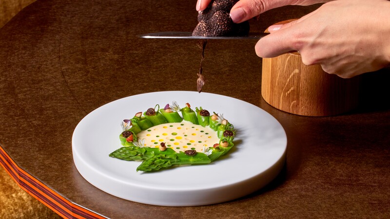 Fill the centre of the asparagus ring with the almond cream, then season the cream with evenly spaced small dots of the 3 different oils (almond, chive, black truffle)