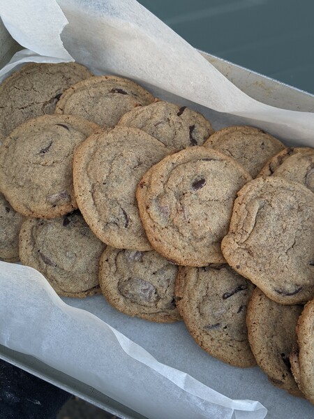 As such, we really wanted wholegrains to be a staple in our pastry offering, so it made sense for us to utilise the eternally crowd-pleasing choc chip cookie as our vehicle. We’ve been baking these every week since we opened, and are happy to report that they’ve done wonders for wholegrain PR here in west Somerset.