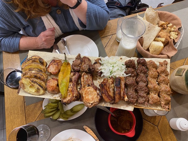 Influences from all these neighbours pepper the cuisine. You’ll find the pickles and sour cream of eastern Europe, but also the yoghurt, bulgur wheat and kebabs (here called khorovats) of the Middle East. Stuffed cabbage might share menu space with dolma, the vine leaves packed with a meaty filling.