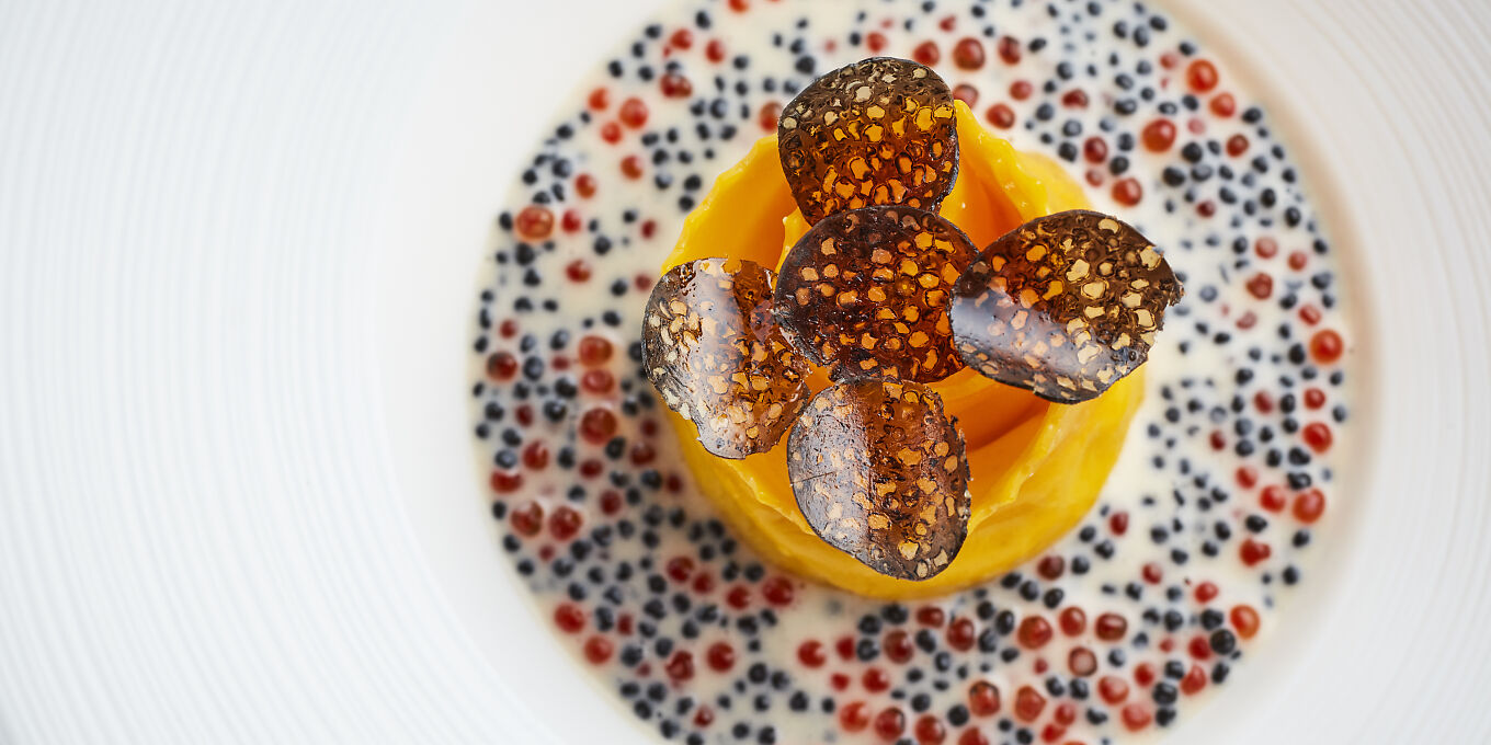 The menu draws influences from the couple’s French and Italian backgrounds, and the results are far from ordinary. Dishes are categorised by character traits such as ‘curious’ or ‘greedy’, and you can build your own five-course tasting menu around these traits. There’s also an à la carte and a good-value lunch menu (available Friday and Saturday). We were intrigued right from the off. A dish of aged risotto Acquarello infused with saffron, topped with roasted bone marrow and gremolata and finished with veal jus was simply delicious, while perfectly pink, perfectly tender Cornish rack of lamb, served with piquillo peppers, black olives, capers and lamb jus, impressed with its precision and clarity.