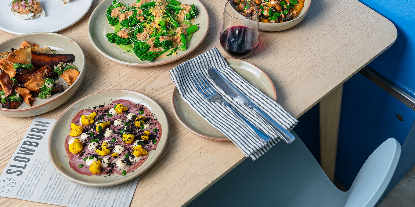Fitting seamlessly inside 'London's only craft jean makers' on Blackhorse Lane, Slowburn turns a working industrial backdrop into something quite informal and quite fetching. Walk past rolls of denim and lines of machinery to reach the restaurant tables laid out at the back of the site; expansive windows allow in dappled daylight during the day, while candlelight and hanging light bulbs create a warm, cosy vibe in the evening. There are also trestle tables out front for alfresco socialising on sunny days. Dining among denim is a novel proposition, but the kitchen backs up its promise with a good-value, vegetable-led menu tuned to the seasons. When we visited it was heralding the arrival of autumn while retaining some fresher ideas reflecting the warmer weather. Depth of flavour and proper savouriness are chef/owner Chavdar Todorov's calling cards, from confit artichoke 'flower' with romesco sauce or black-bean gyoza tacos fired up with a zippy coriander salsa to a main course of Slowb...
