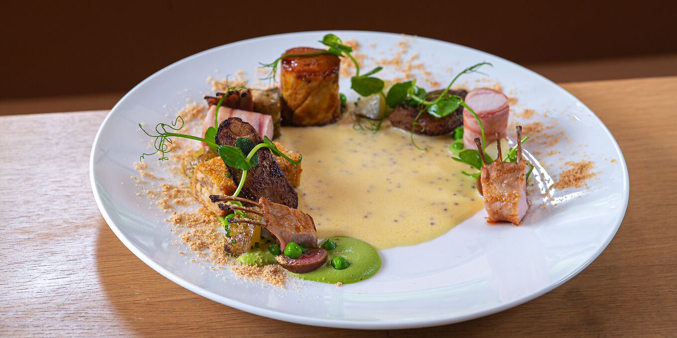 That doesn't preclude acknowledgements of traditions beyond the Anglo-French matrix, giving tuna the Japanese treatment with with wasabi crème fraîche, pickled cucumber and crispy nori, for example. At main course, halibut might be arrive coated in ‘nduja and served with tiger prawns and kale in beurre blanc, while venison loin appears with lightly curried pithiviers, mushroom purée, blackberry ketchup and gaufrette potatoes.