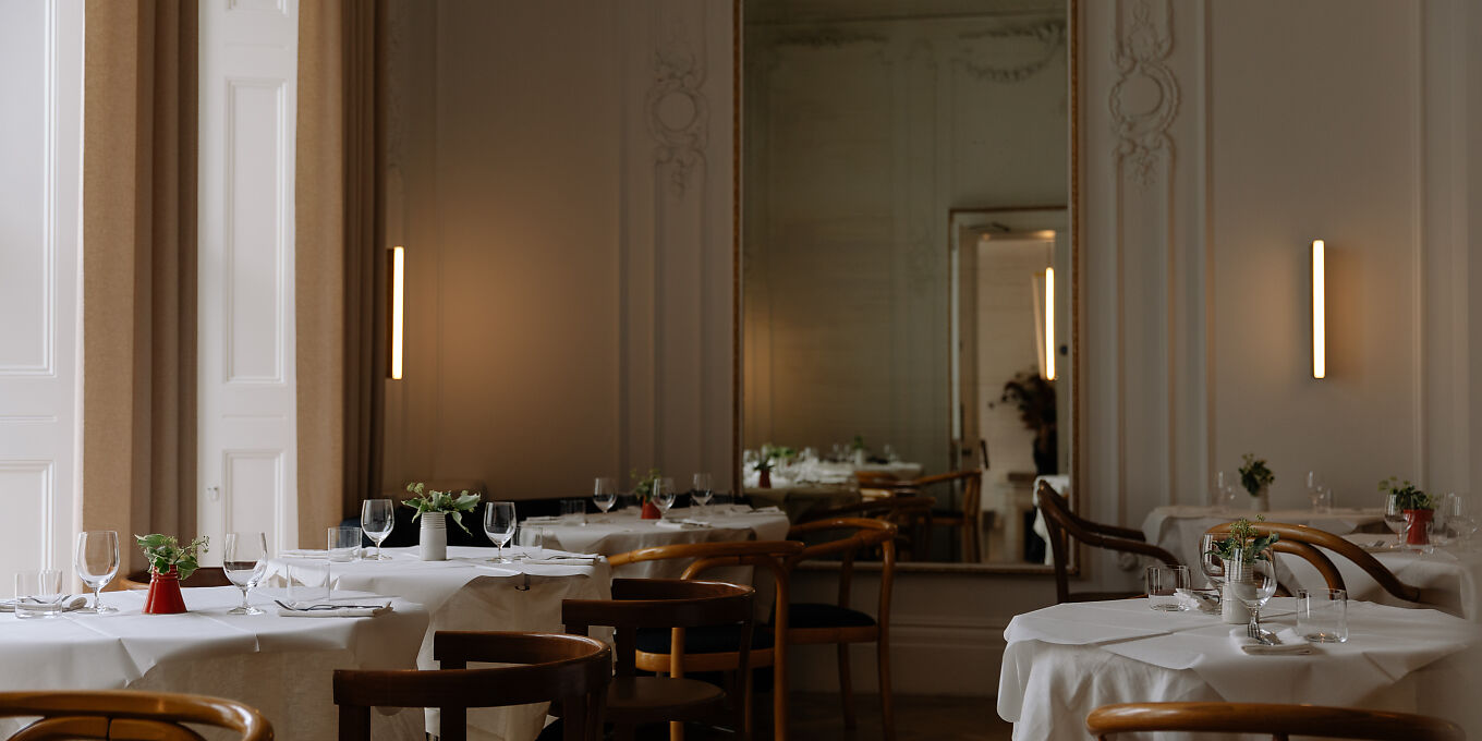 The handsome Georgian townhouse once occupied by the Anglo-Irish war artist Sir John Lavery has been restored to provide an elegant, cooly refined first-floor restaurant reached by a grand staircase. The uncluttered, creamy-white interior with its ornate plasterwork and soaring gilt-edged mirrors captures the light from sky-high windows, while the bar area is dominated by a sweeping zinc counter. Moving into the main room, you'll find contemporary wooden seating and a shiny parquet-pattened floor. Some diners by the window, however, are deprived of a view and others next to the lofty open period doors may feel hemmed in.